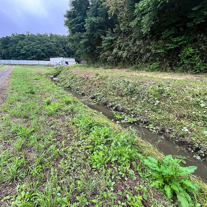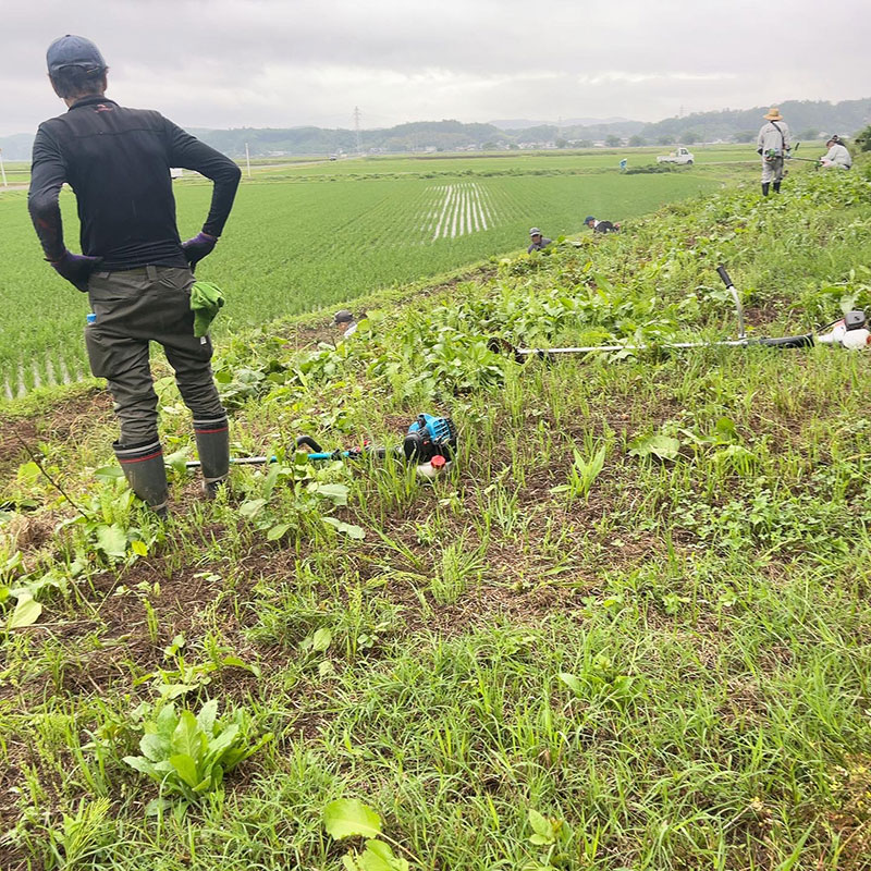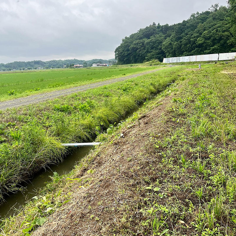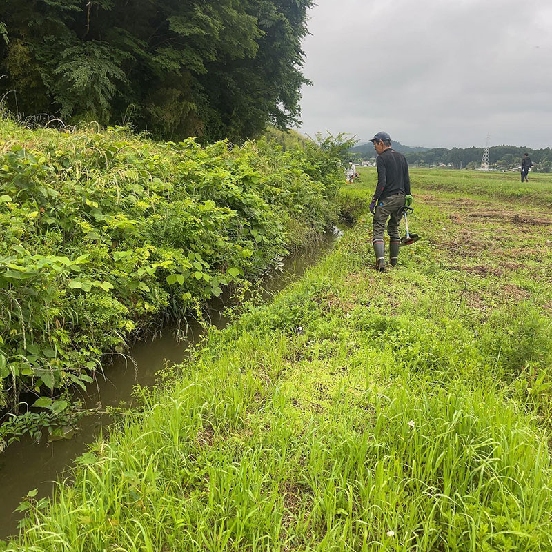 水路脇の45度を超える斜面の草刈りはかなりハード。