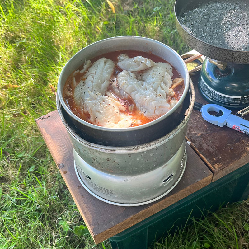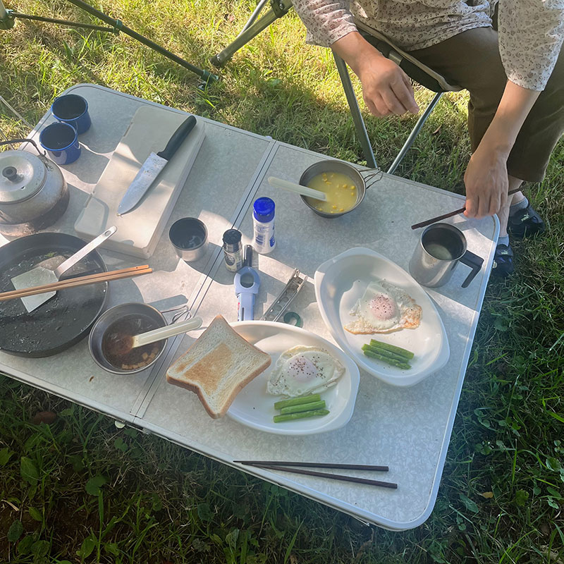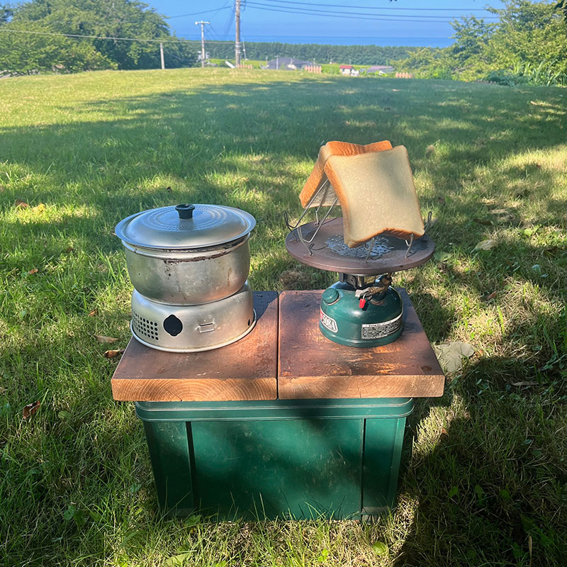 新しいテントで迎えた朝。寝心地は良かったけど微妙に傾斜があったので体が微妙に調整しようとしたのか少し体が痛い。ワンバーナーでトーストを焼いて