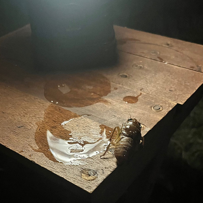 ふと見ると木の椅子に羽化しようとしてるセミの幼虫。そこでは羽化できないよ、と思っていたらどこかへ歩いていった。無事羽化できますように。