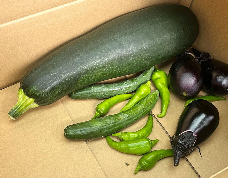 畑で採れた大きなズッキーニ、茄子ときゅうり、今年不作の万願寺とうがらし。