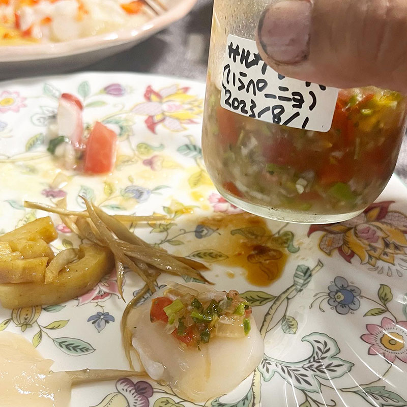 北海道のホタテの刺身とカルパッチョ。タコとトマトのサラダ。アボガドとマグロ。茄子の揚げ浸し。じゃがいものドフィノワ。蓮根のカレー風味。きんぴらごぼう。