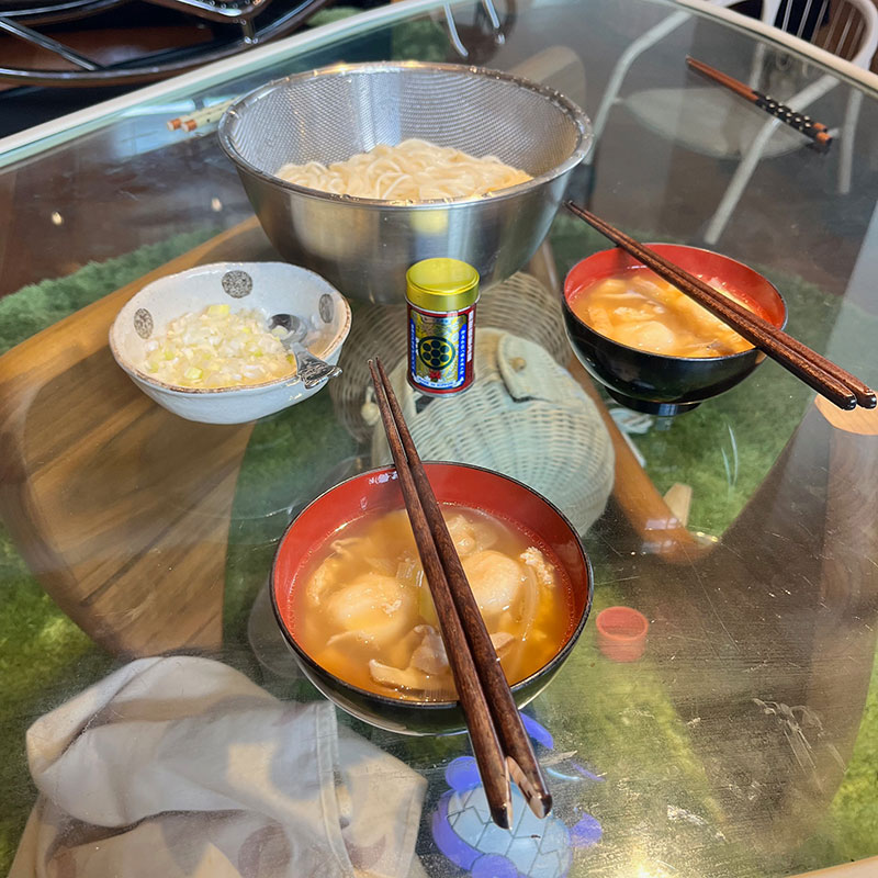 昼飯に小豆島のそうめんとつけ汁ちゃちゃっと作ってくれた。美味しかったー!料理上手!