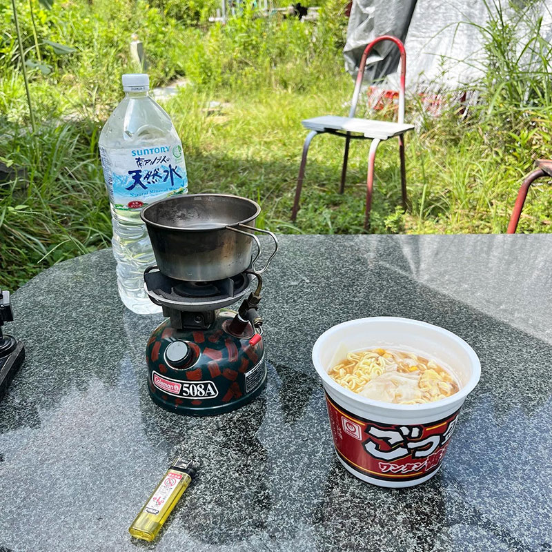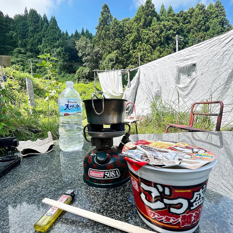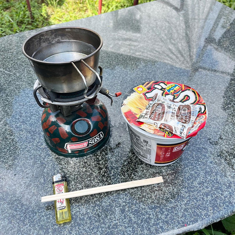 朝、少し涼しくて食べられそうだったので仕事場のプレハブ小屋に常備してあったカップラーメンを塩分と水分の補給を兼ねて。