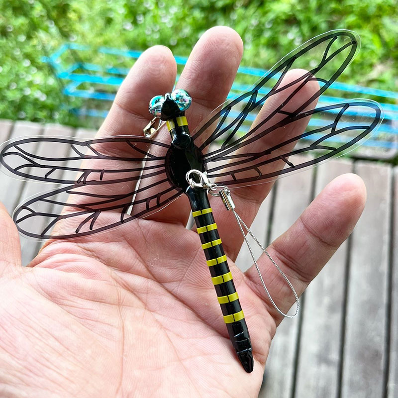 この商品黒いプラスチックに細い黄色のテープを貼って胴体にしたり透明なアクリル板を羽の形に切って油性マジックで羽の模様を描いてものすごい手作り感。儲けが出るだけの数作るの大変だろうなぁ。。。