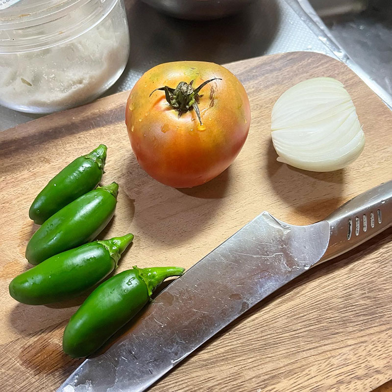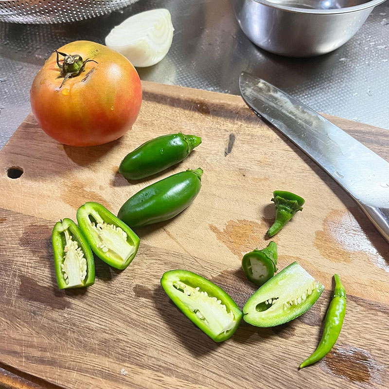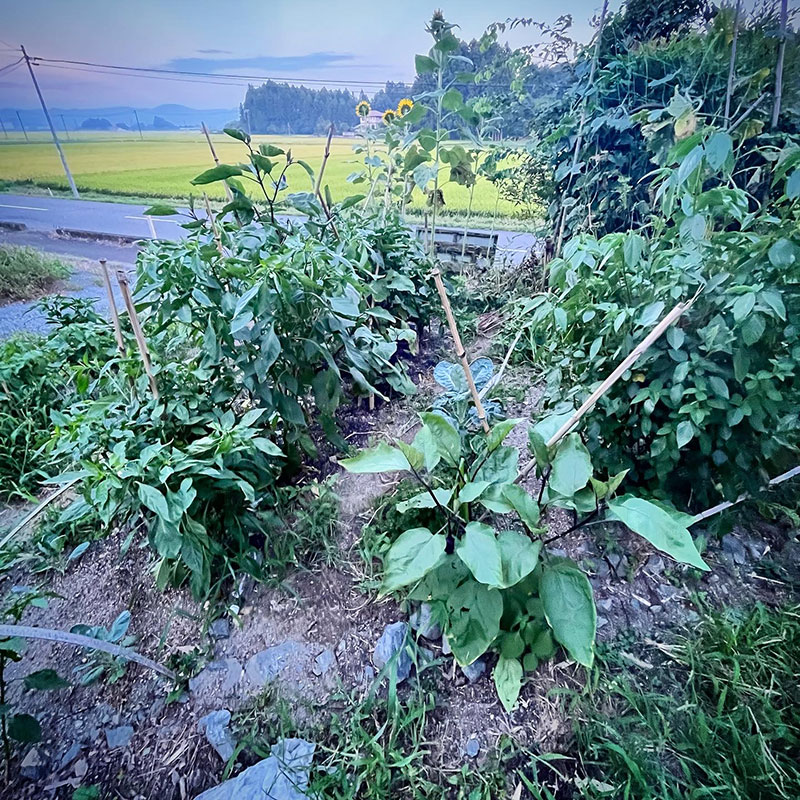 小さな株ひとつ、このまま畑に残して種が取れるかやってみる。ハラペーニョもいくつか実をつけたので収穫して今宵サルサソース作る。