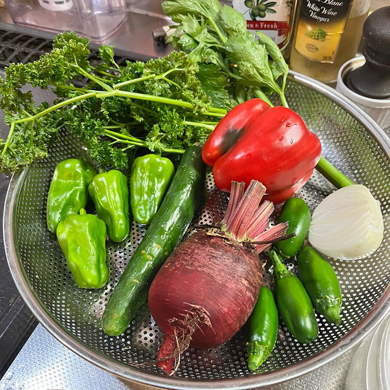 必要な野菜、きゅうり、ピーマン、赤パプリカを畑から収穫。明日のボルシチ用にセロリも採っておこう。