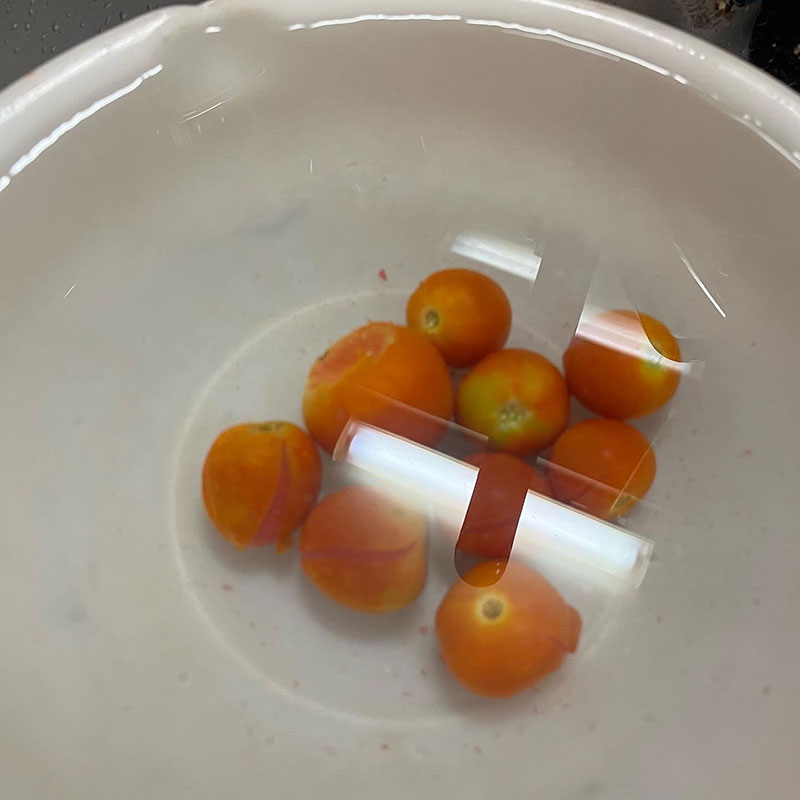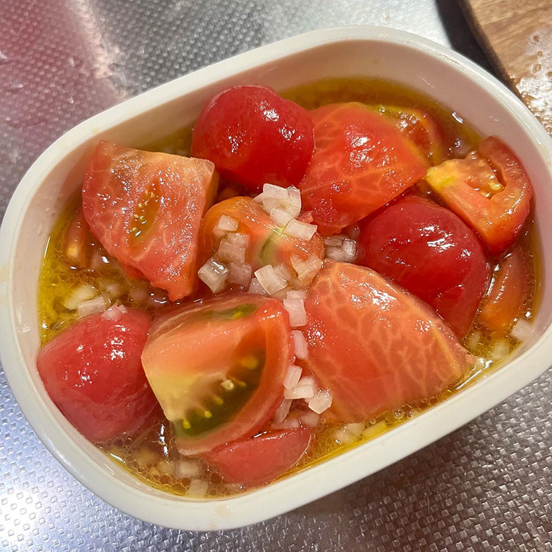 尻が硬くて美味しさがイマイチだったミニトマトは玉ねぎとハチミツとオリーブオイルでマリネする。明日のつまみになるだろう。