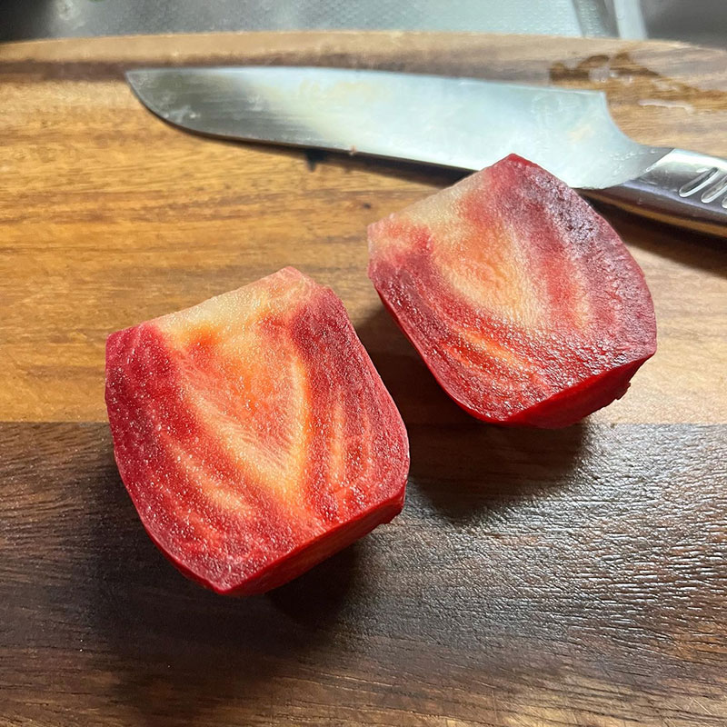 明日ボルシチを作るために下茹でした畑のビーツは皮を剥いておく。