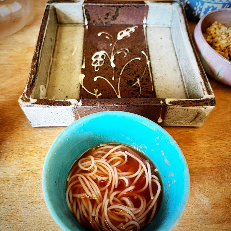 大学時代の友だちの陶芸家の器。麺を盛り付けてる風情も食べ終わって柄が出てくるのも楽しい。
