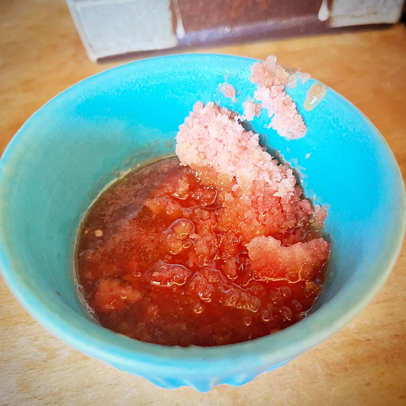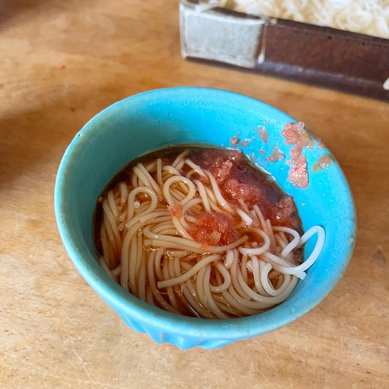 さらに麺つゆに凍らせたトマトのすりおろしを入れて冷たさと旨みをアップ。冬に温かくいただくのも美味しいけど油を使ってない白石温麺のこの喉越しの良さと美味しさは稲庭うどんや揖保乃糸やオカベの麺にも負けてない、