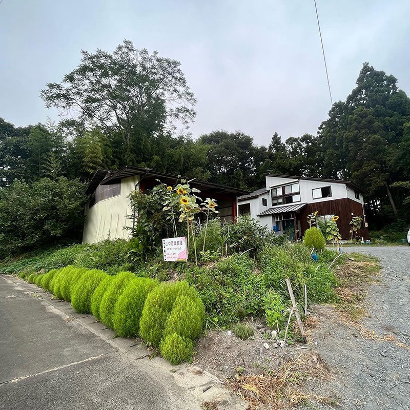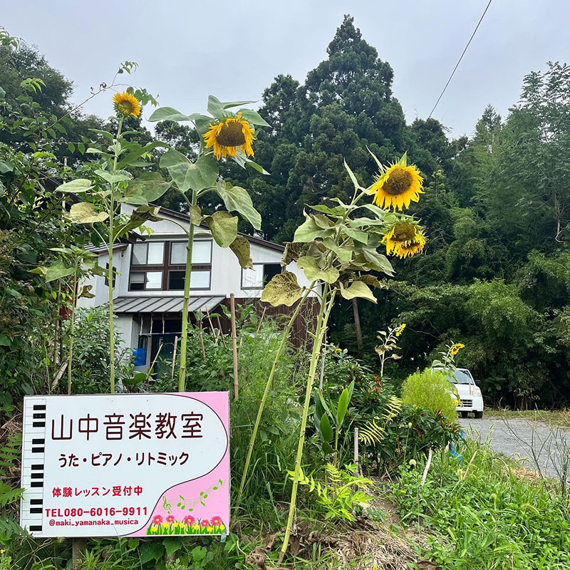 カミさんの音楽教室の看板の周りを黄色の花で囲もうと思ったけど草丈が高すぎた。
