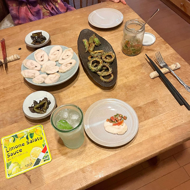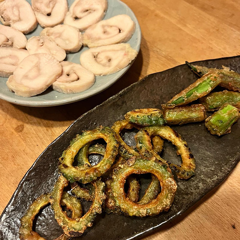 ゴーヤとオクラの唐揚げや。ゴーヤ、スナック菓子みたい食感も楽しい。チャンプルーと全然違う。