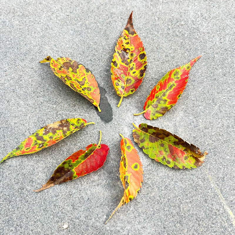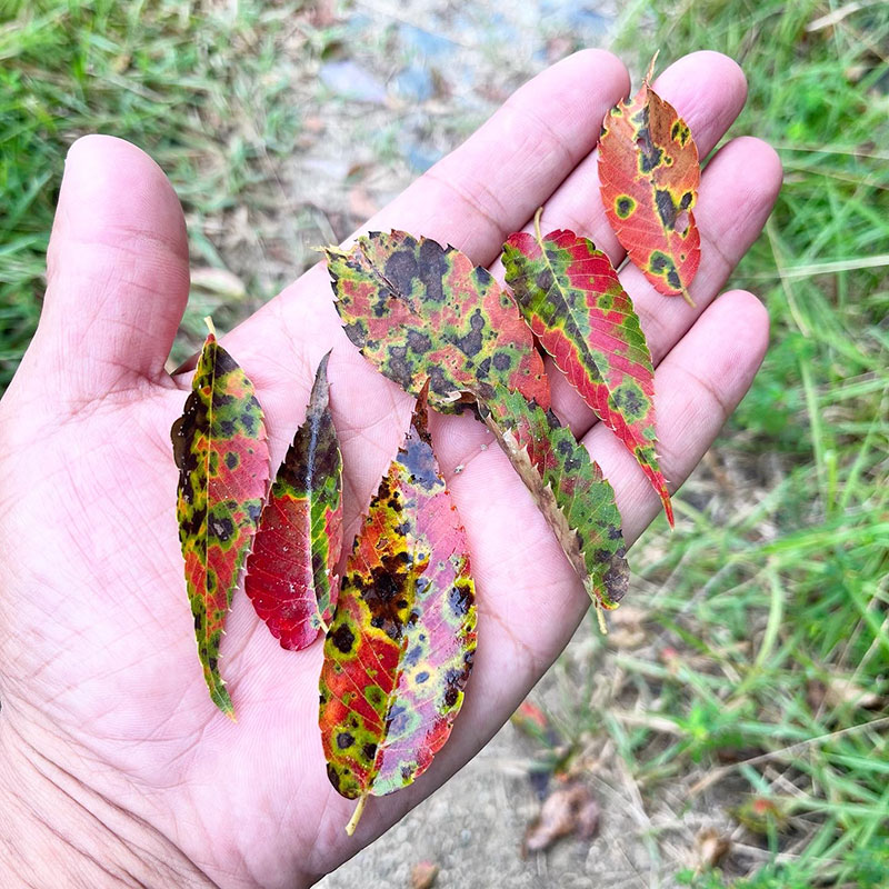 仕事場の入り口に夏の終わりになると迷彩柄になって落ちてくる葉があって何の木かわからないけど楽しみにしてる。