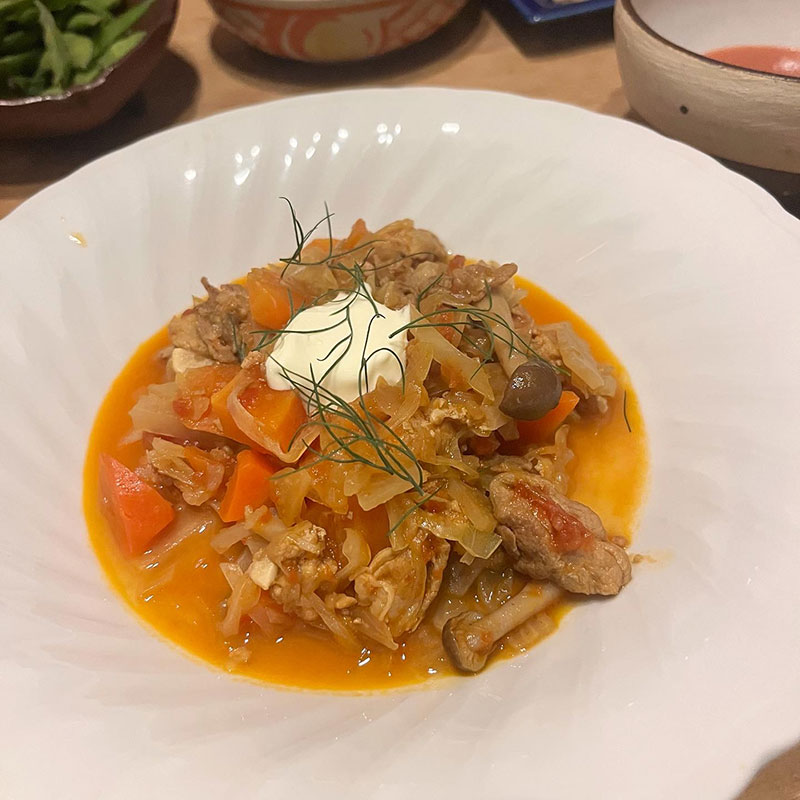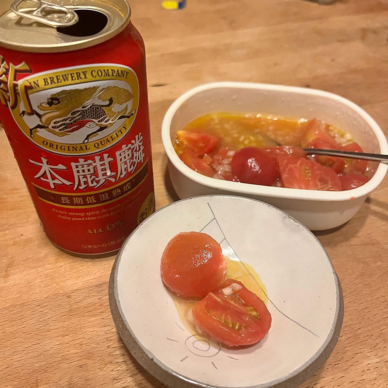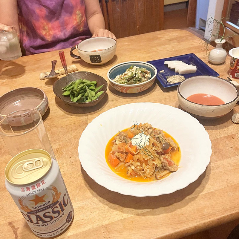居酒屋我家、開店。ほとんど昨日と同じメニューw 畑のビーツで作ったボルシチ。