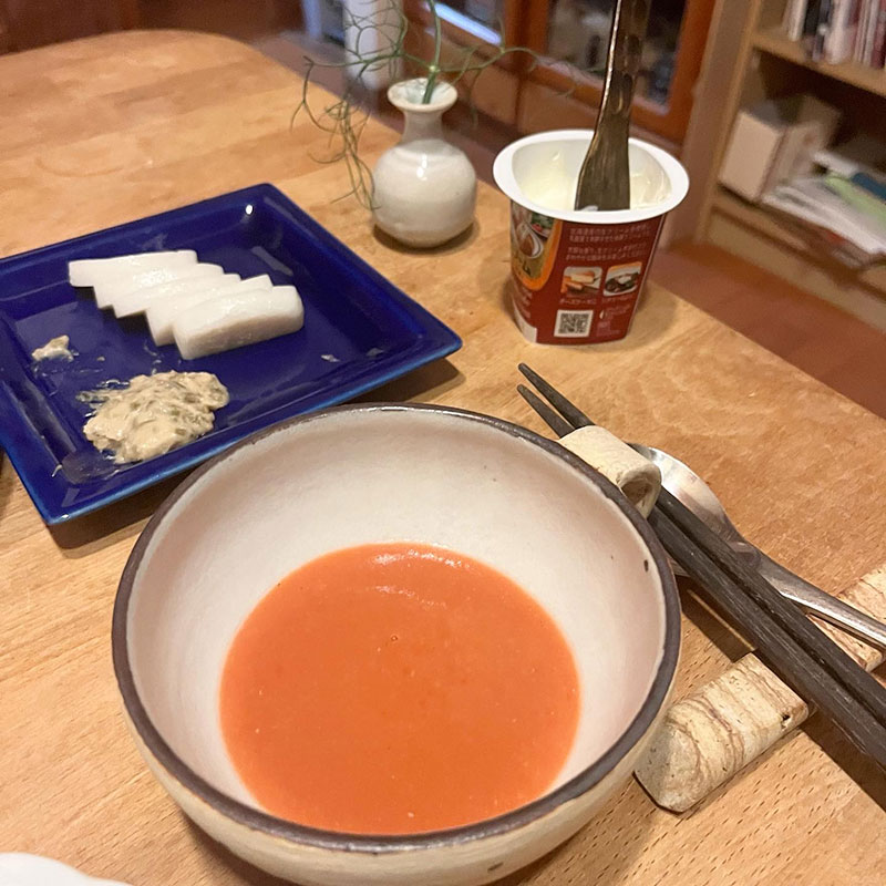 畑の赤パプリカやきゅうりも使ったガスパチョ。