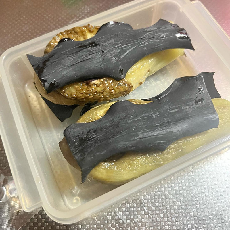グリルで畑の茄子も焼いてたんだけどお腹いっぱいになってしまったので昆布〆にしてみる。