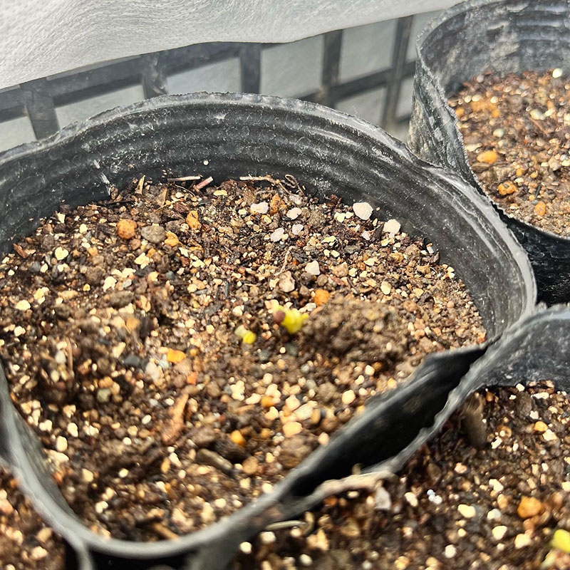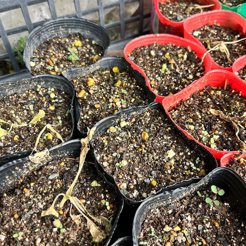 数日前に慌ててまき直した種はこの暑さと湿気でもう発芽。でも今からでは結球しないだろうな。