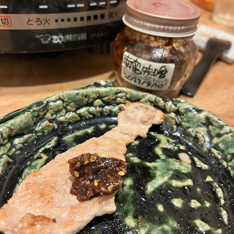 地元の産直あぐりっとで買った豚肉を焼いて南蛮味噌つけて食べたら