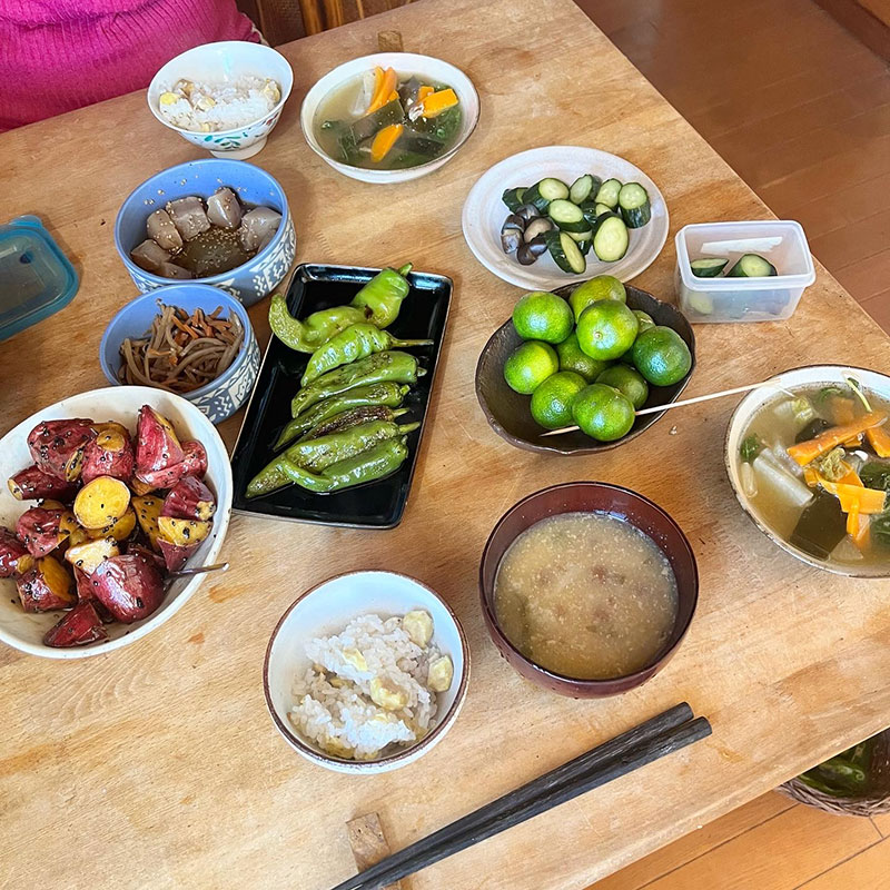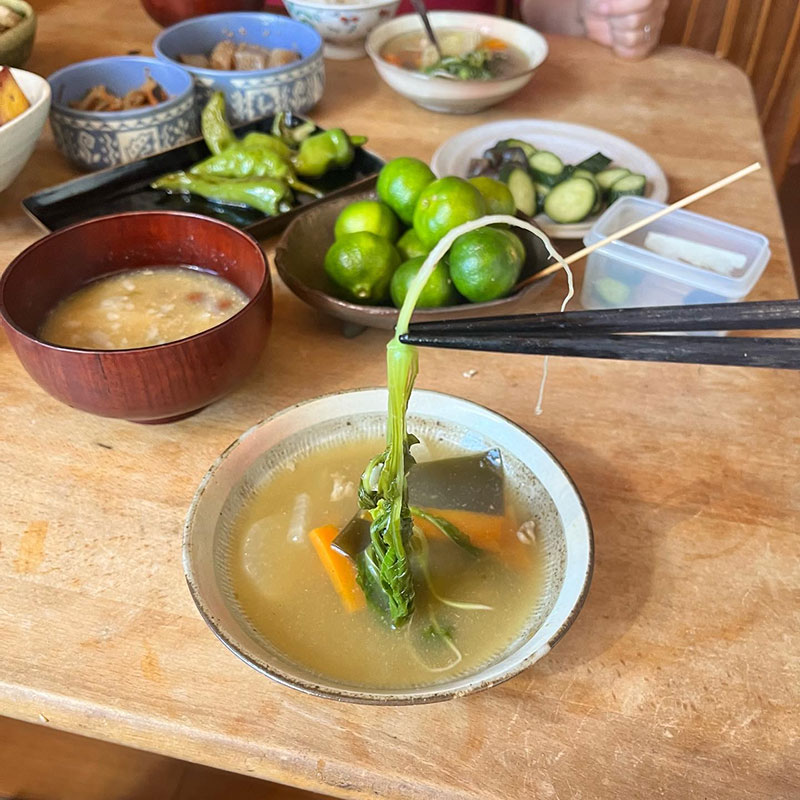 間引き大根入れて丸ごと煮たもの。なめこの味噌汁には採りたてを沖縄から贈ってくれたシークワーサーを搾った。