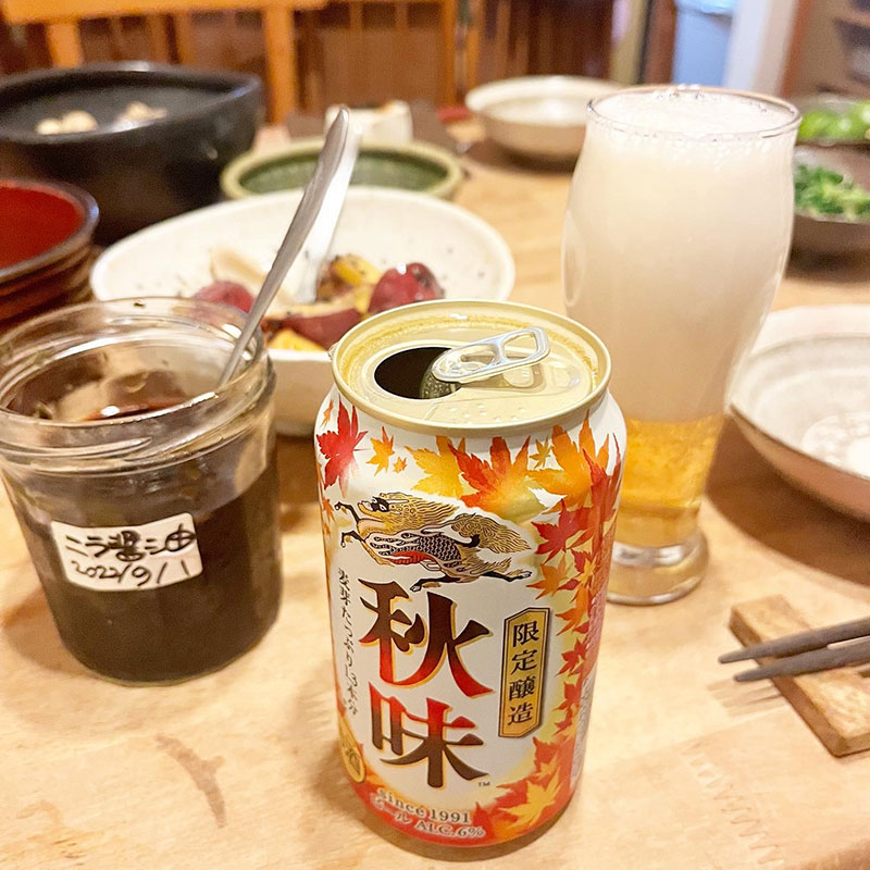 秋味のビール。今だけのご馳走、落花生の塩茹で。