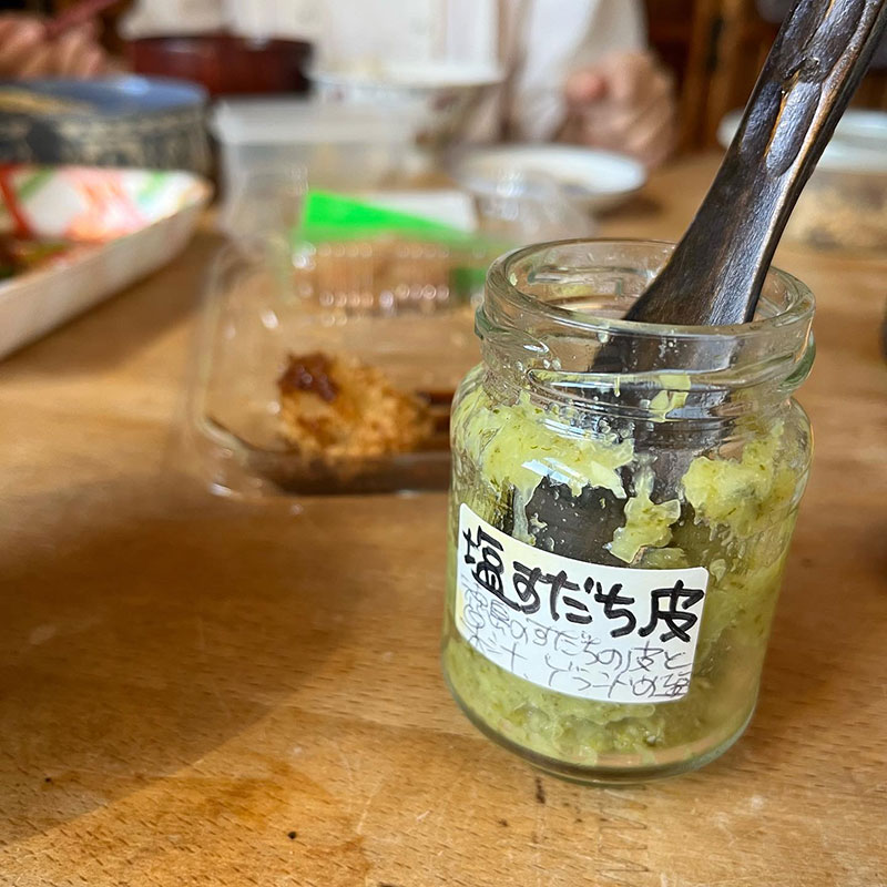 カキフライにも味噌汁にもすだちを塩とハンドブレンダーにかけた塩すだち皮を合わせて。