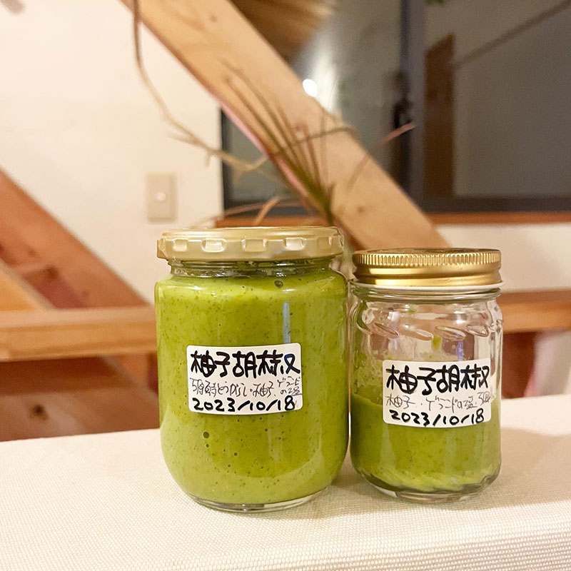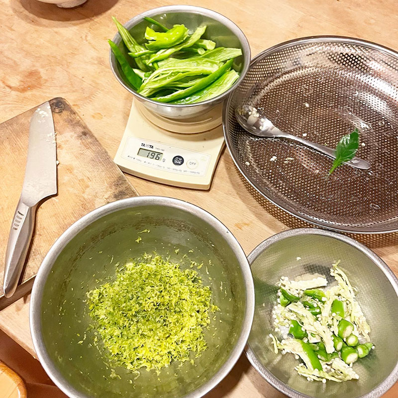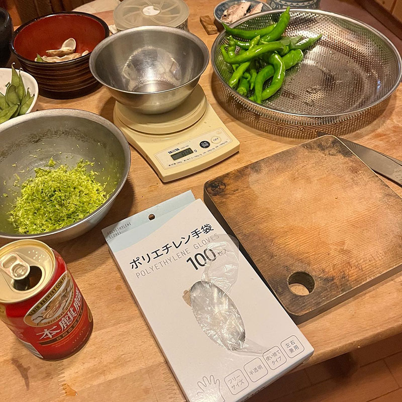 今シーズンの鍋用の柚子胡椒はもういくつかあるので来年用に一年寝かすつもり。畑で唐辛子作ってるけど赤くならなかった青い唐辛子は小さいので手間が大変。去年と同じく辛くなってしまった万願寺とうがらしを青唐辛子の代わりに使う。大きいから手間が省ける。