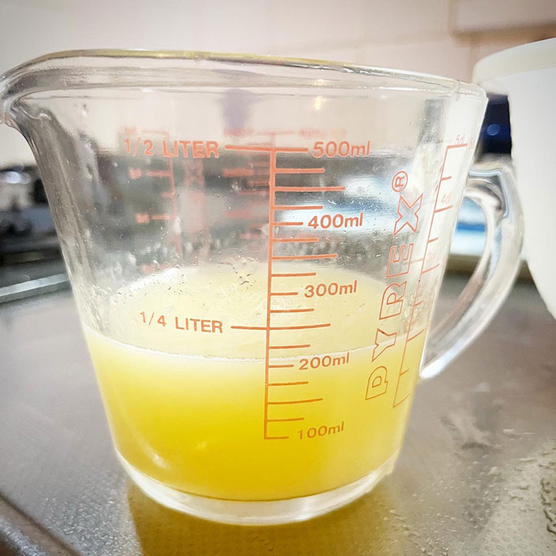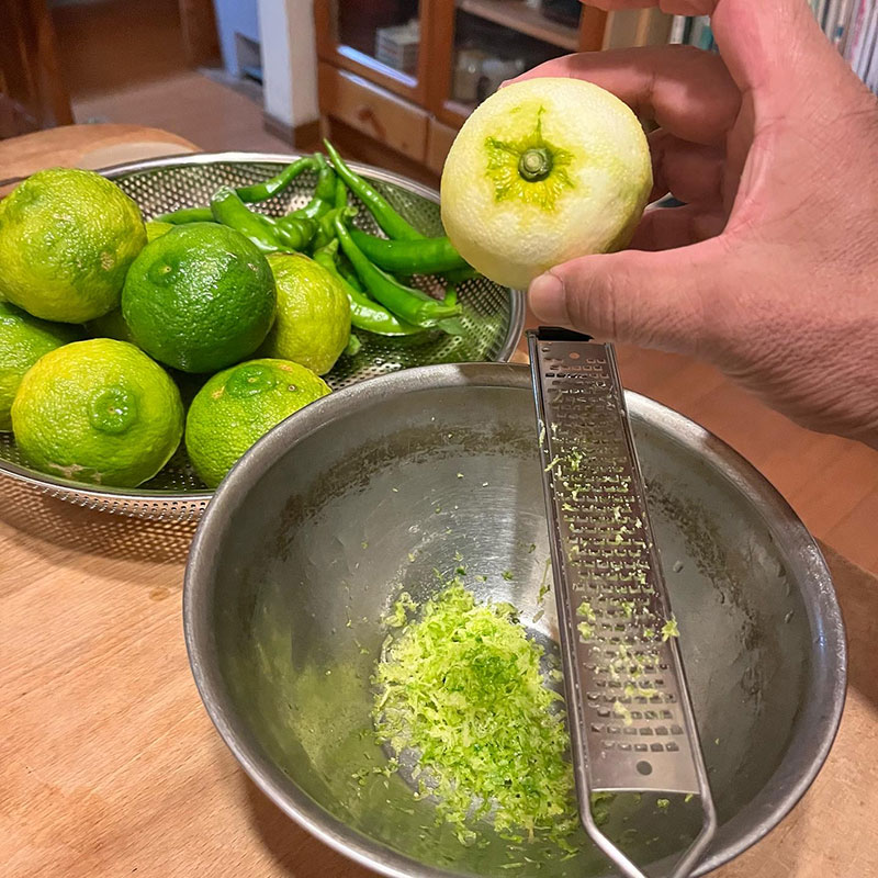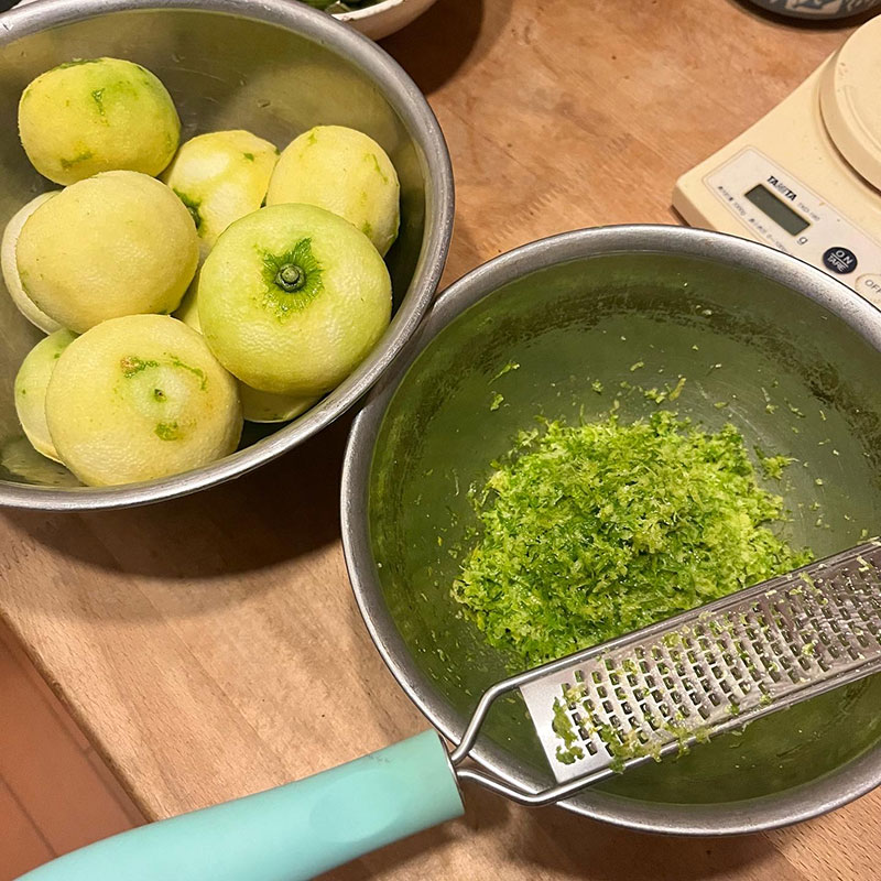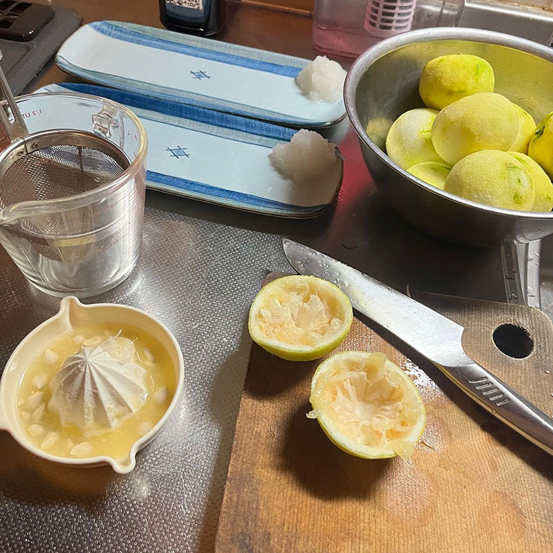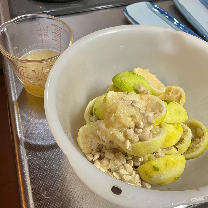 柚子胡椒を仕込んで皮を擦った後の柚子の果汁を絞った。