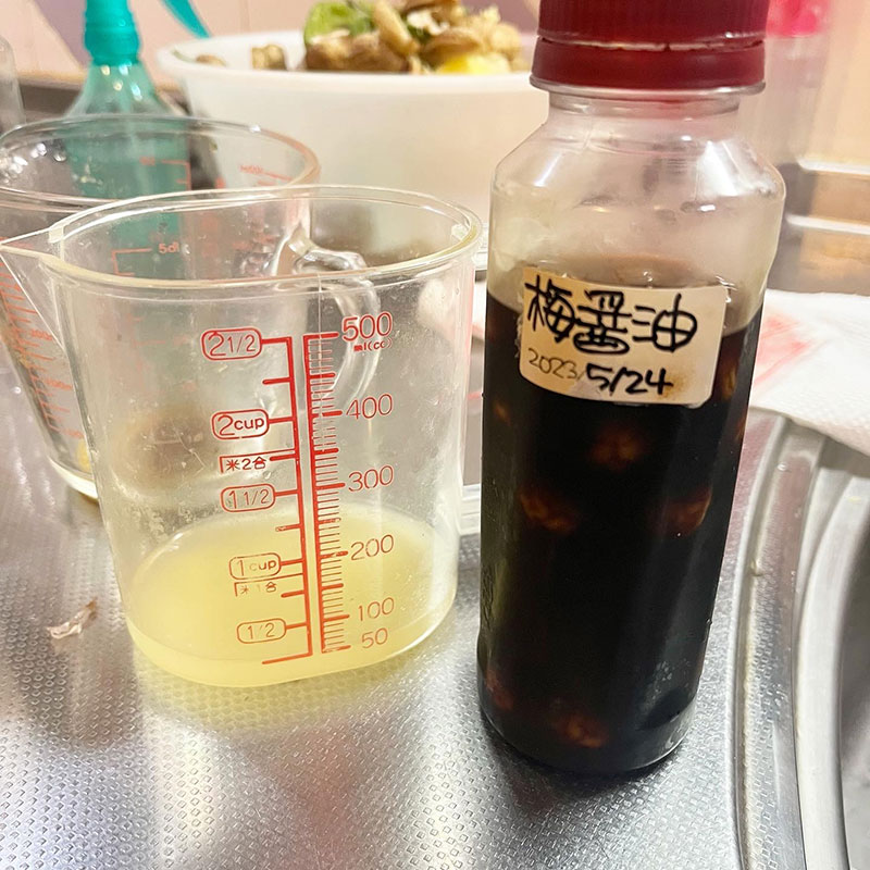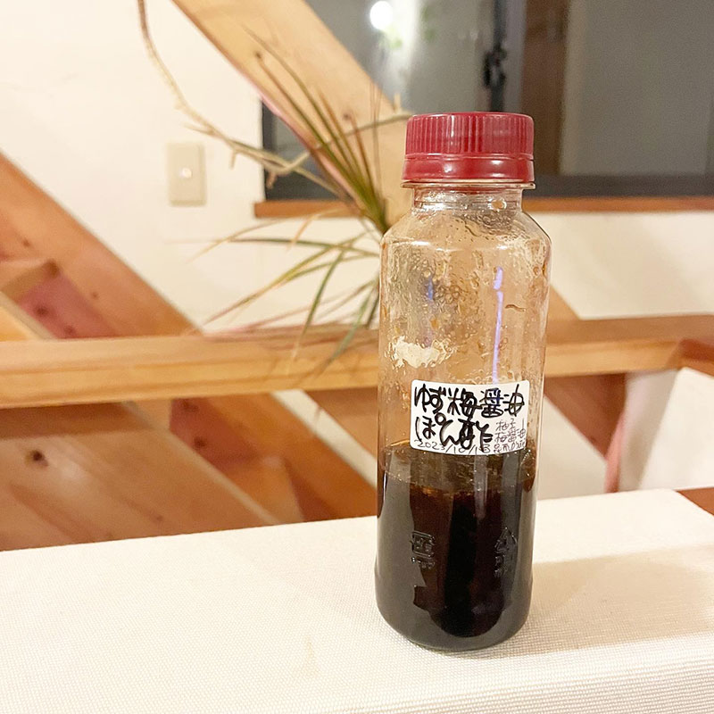 残りの50mlを庭の梅の実を漬け込んだ梅醤油と合わせたポン酢も作ってみる。