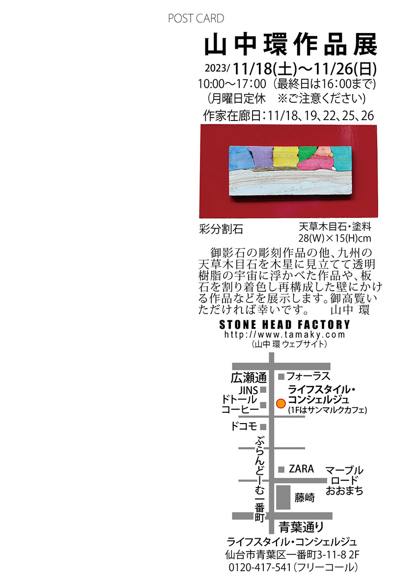 ほとんど人に作品を見せることもなく、何年もひとり山で石を彫り続けていた。東日本大震災を機に作品を誰かに見てもらいたい、と思って個展をやろうと思った時にライフスタイル・コンシェルジュのその当時のチーフだった成田さんに”山中さんに是非、こちらで個展をやって欲しい”と言っていただいて初めての個展を開いてから10年が経ちました。毎年、個展を続けて年によっては一年に2回個展をやってきました。そして、初めて個展をやらせていただいたライフスタイル・コンシェルジュでは6回目となる個展を1ヶ月後に開催していただく予定になっています。