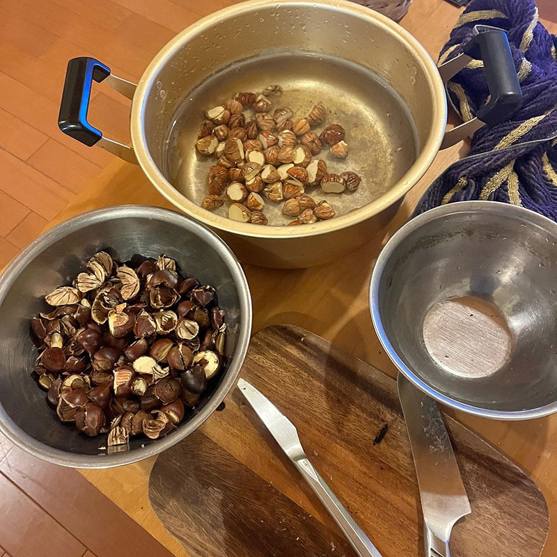 れでもやっぱり小さな栗の皮剥きは大変だ。水に1時間くらい浸しておけば鬼皮は簡単に剥ける。渋皮をみんなはどうやって剥いてるんだろう。