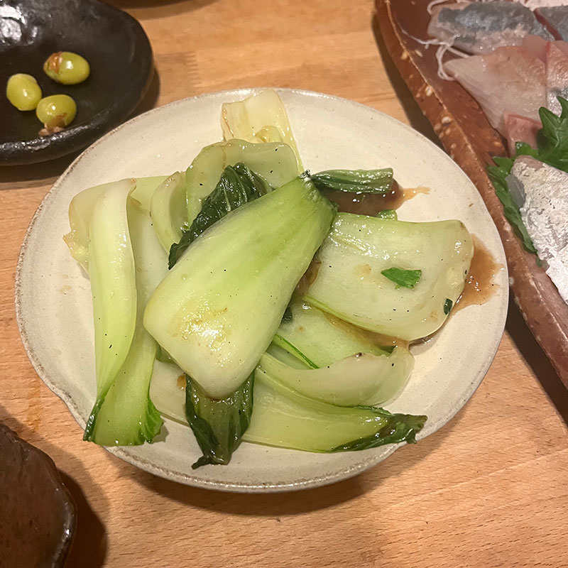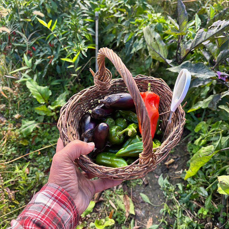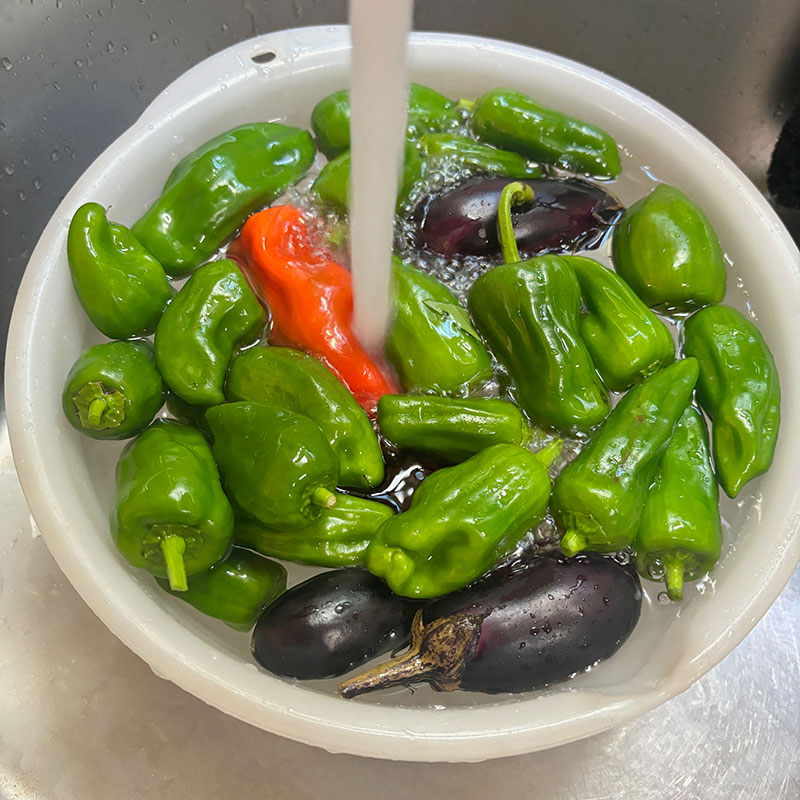 青梗菜の炒め。畑の茄子とピーマンだらけ。