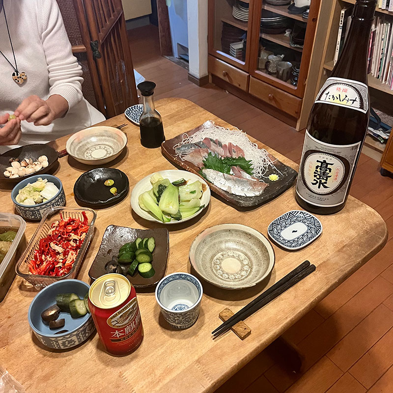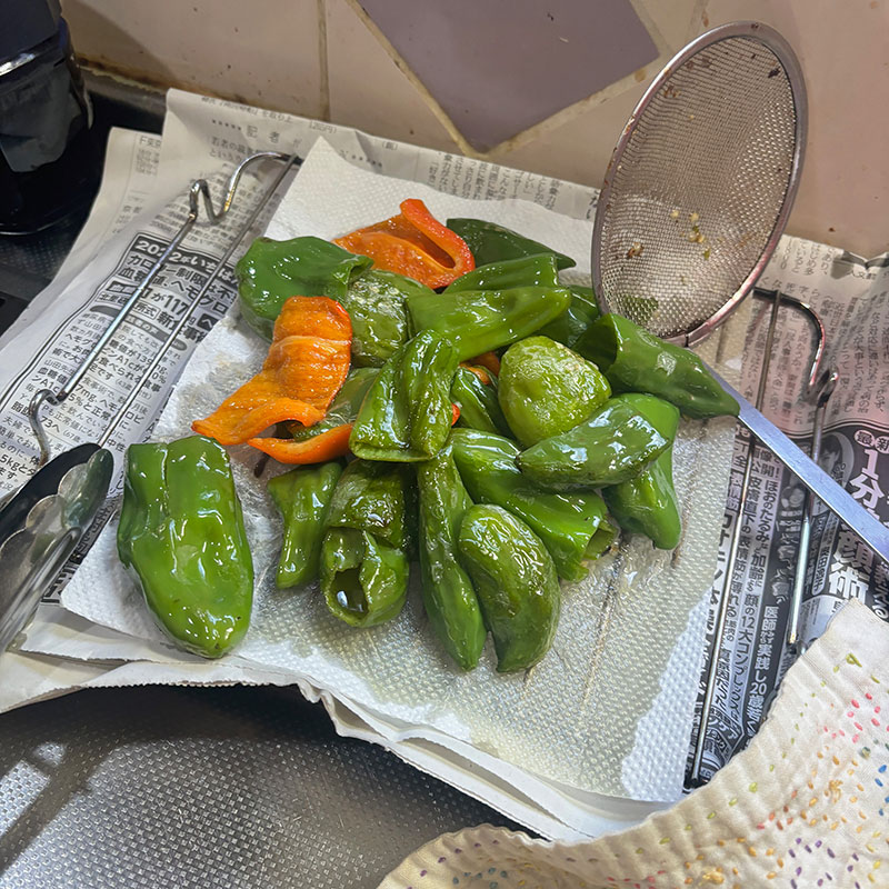 赤ピーマンで作った無限ピーマン。本麒麟と刺身には秋田の日本酒、高清水。