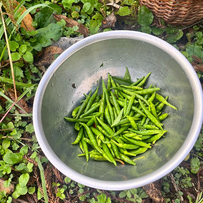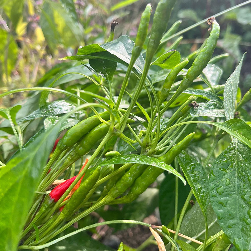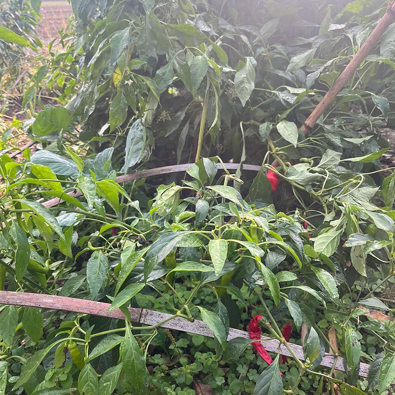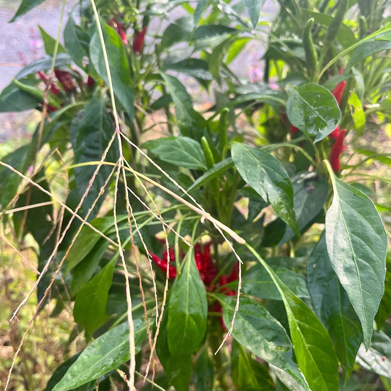 朝、畑の赤唐辛子の