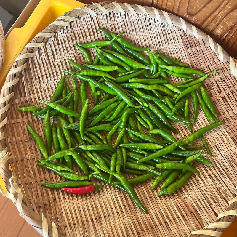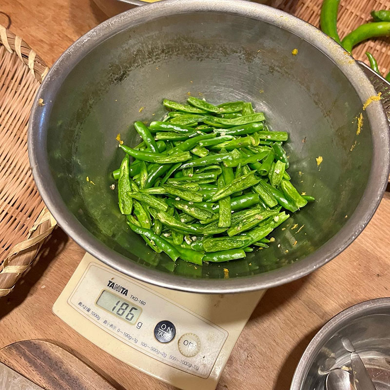 次にヘタと種を取って同量の唐辛子を用意する。大きな青唐辛子なら10個くらいですむだろうけど小さな青い赤唐辛子のヘタと種を取るのは大変。