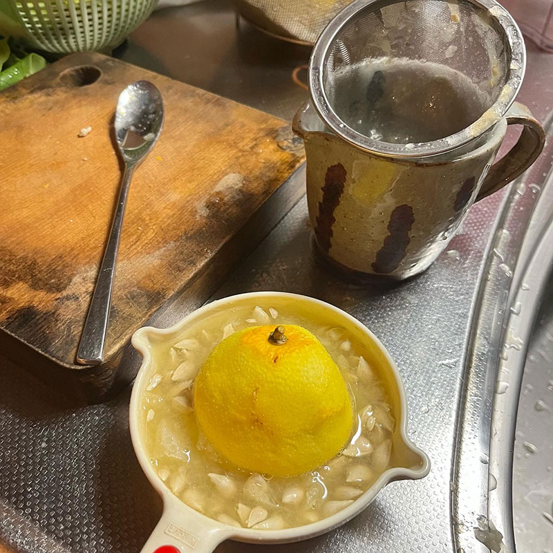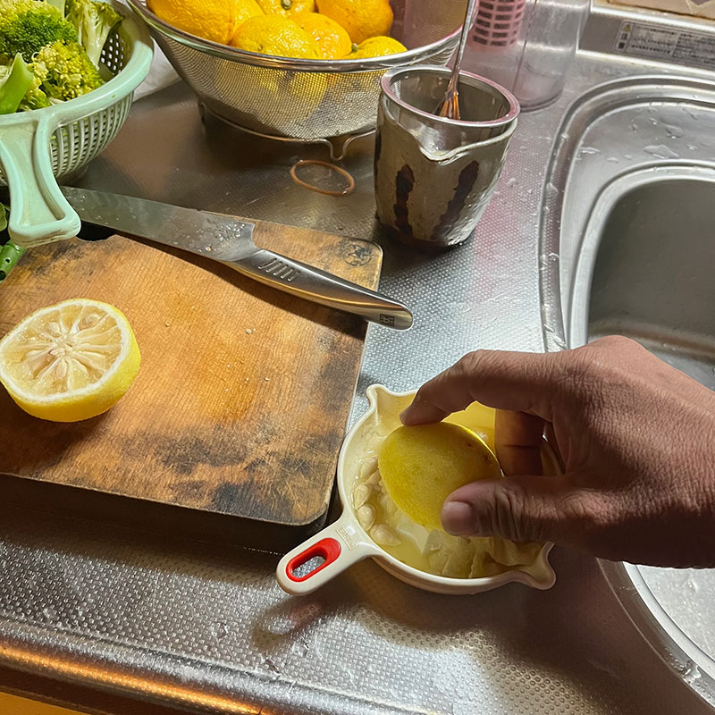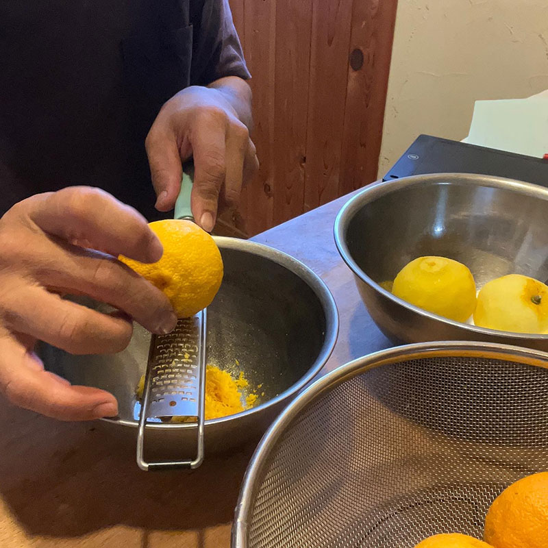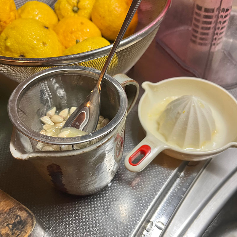 柚子胡椒を仕込んだ後の柚子の果汁を絞って