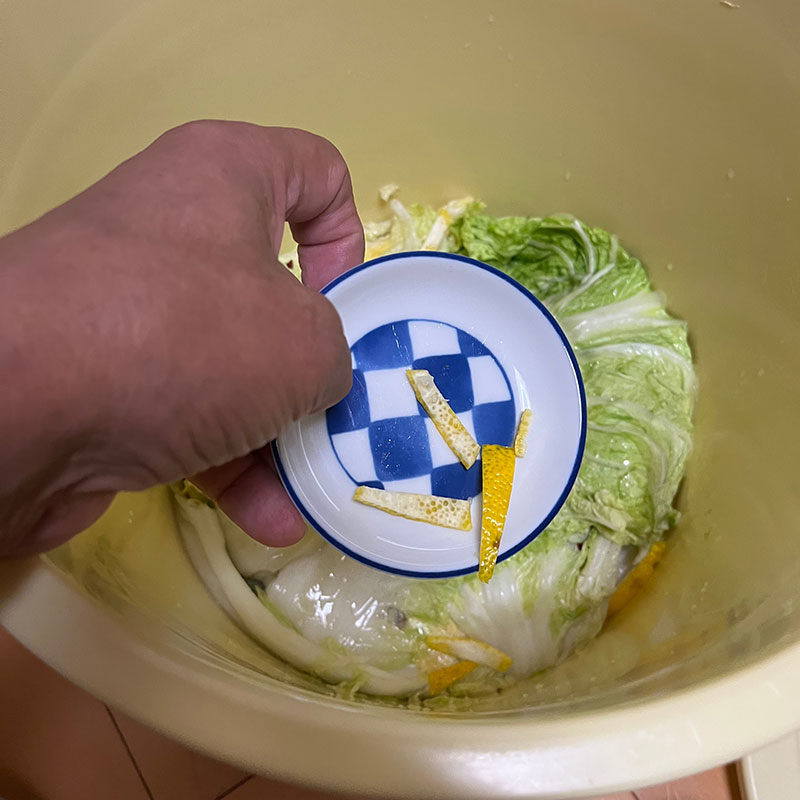 ザルで乾燥させたら柚子の無い時でも白菜漬けに柚子の風味をプラスできる。