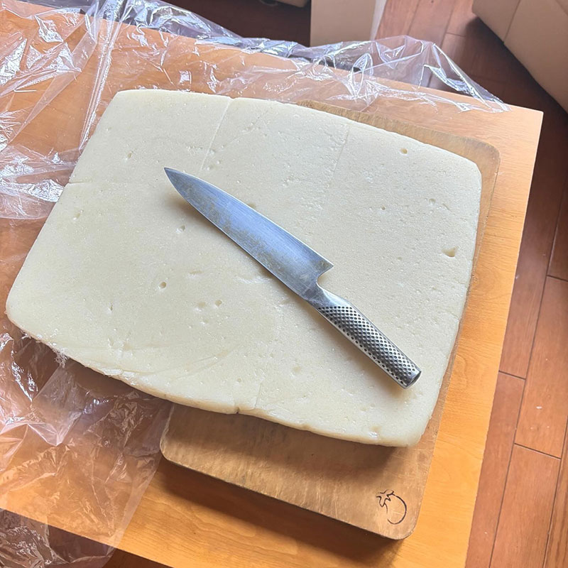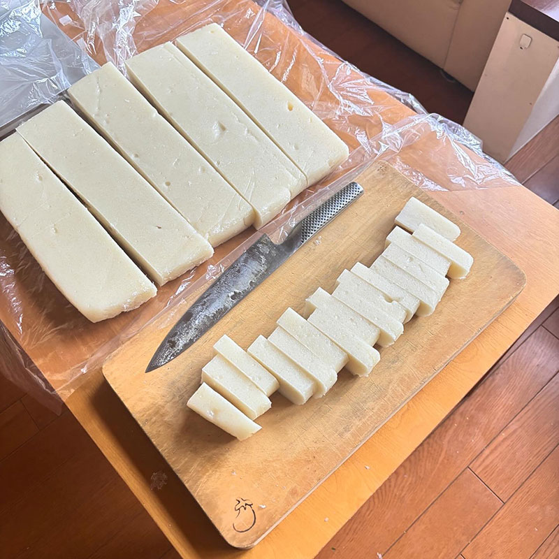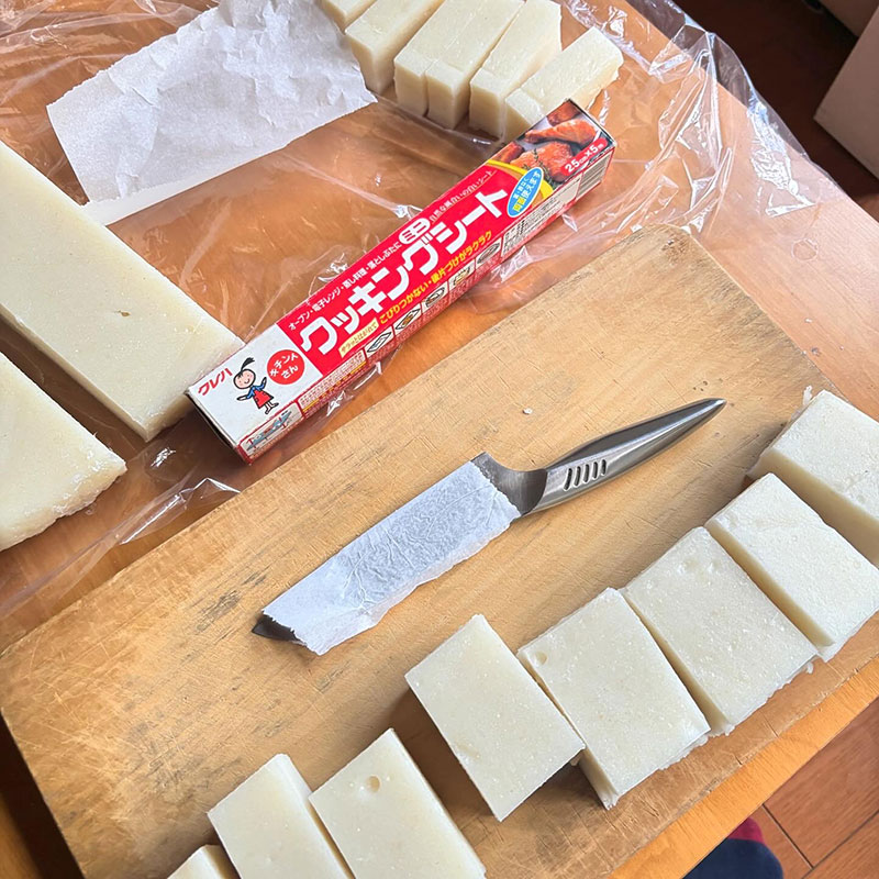 昨日、杵と臼でついた餅を切る。