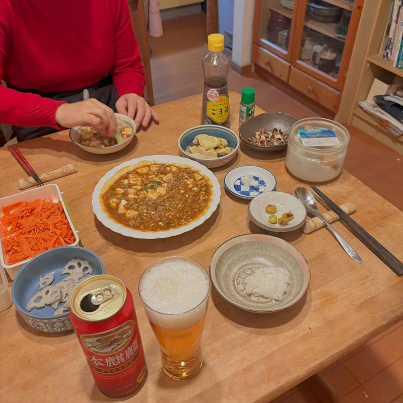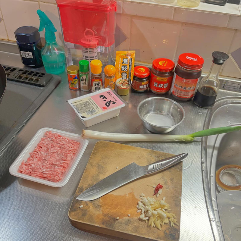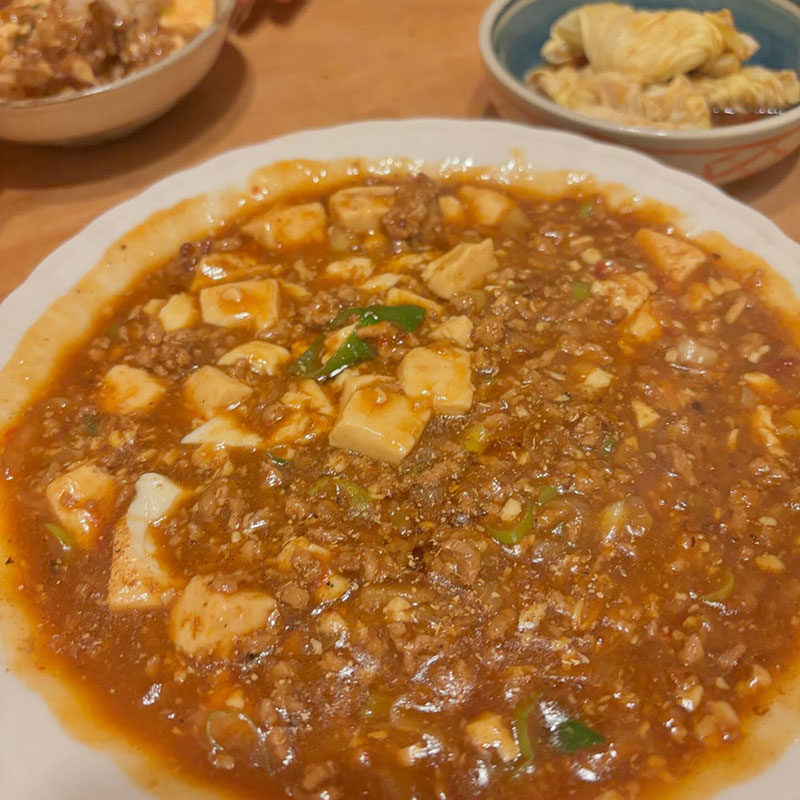 絹豆腐で作るのが好き。豚ひき肉と豆板醤を焦げる寸前までしっかり炒めると臭みが残らず旨み倍増。甜麺醤はもちろん豆豉醬は欠かせない。