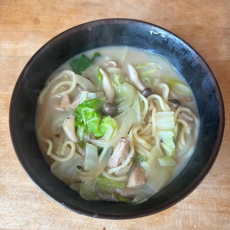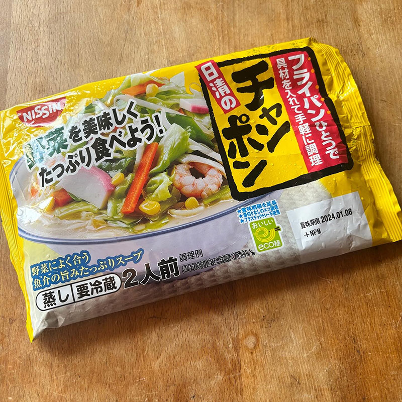 フライパンひとつで具材を入れて手軽に調理 日清のチャンポン の昼飯。