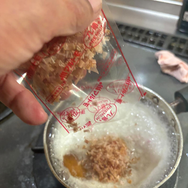 沸騰したらパックの鰹節もそのまま入れてしまう(濾さない)。