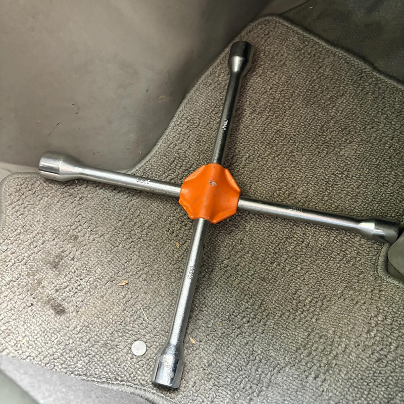 いつでも増し締めできるように十字レンチ助手席の足元に。