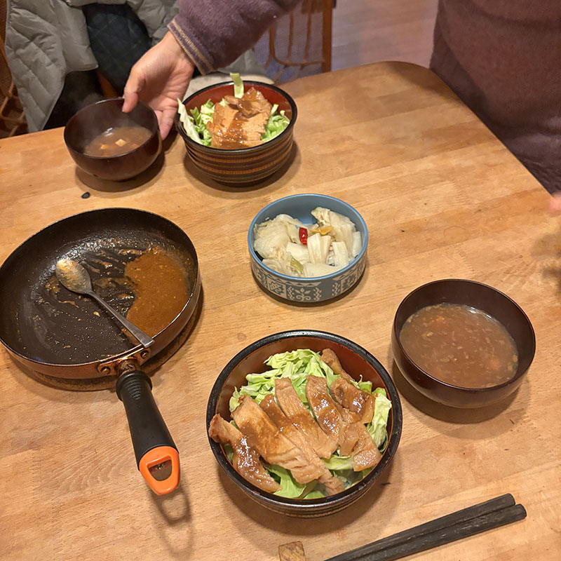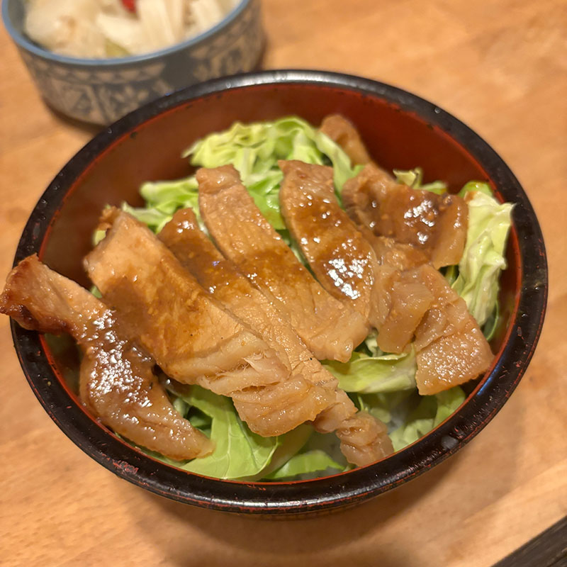 味噌漬けの豚ロースを丼にして夕食。少し厚めに切ったキャベツたっぷり。