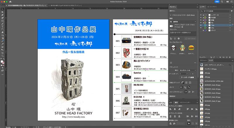 今回は小さなオブジェの作品もたくさんあるので全作品の写真、寸法、重量、素材、価格の入ったカタログの制作はページ数も多くていつにも増して大変。