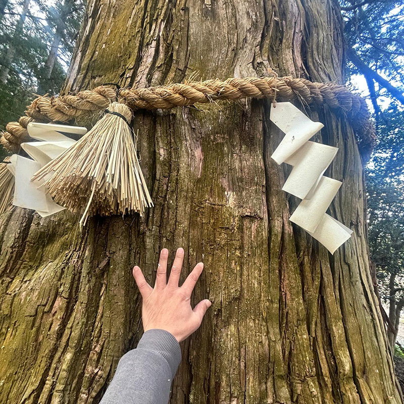 樹齢800年の杉の巨木に手を触れてパワーをいただいた。