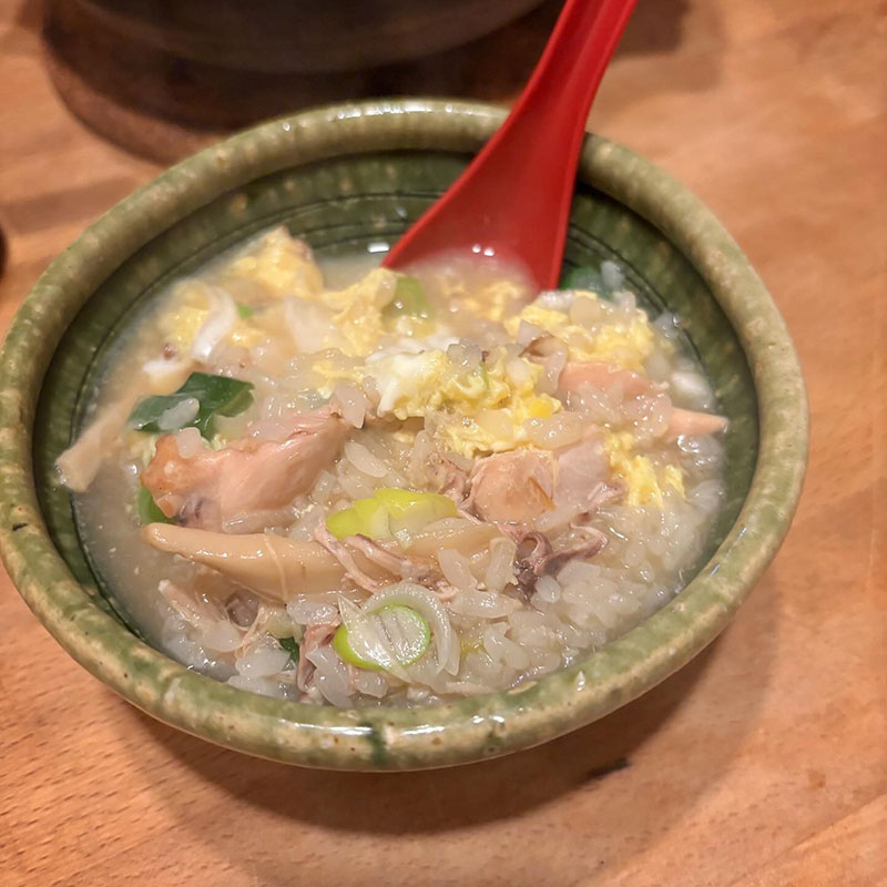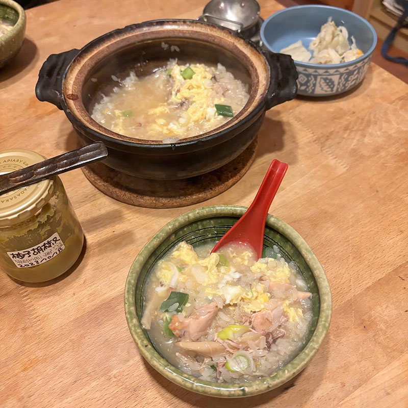 夕食は昨晩の鶏白湯鍋の残りでおじや。