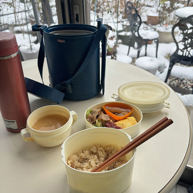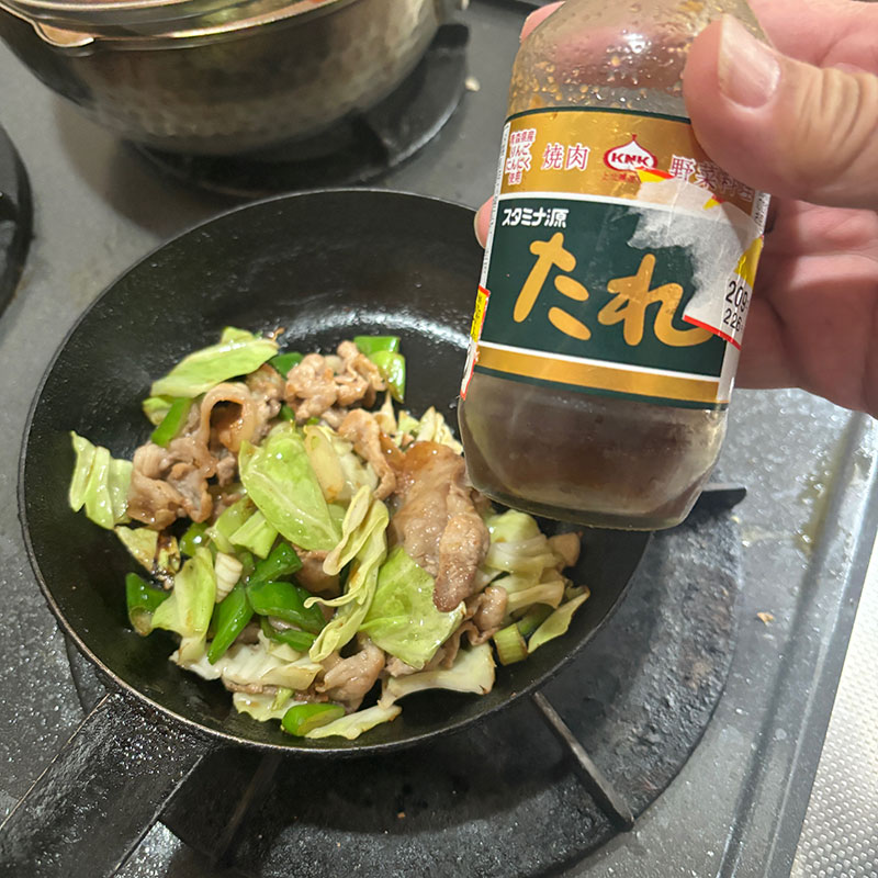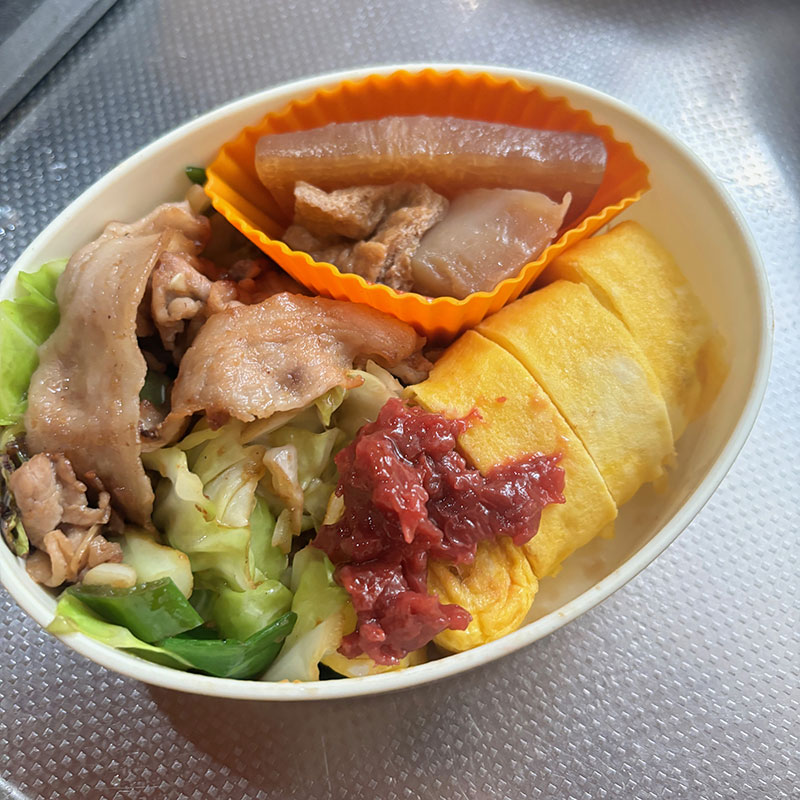 キャベツと豚肉焼いた弁当持って出かけます。