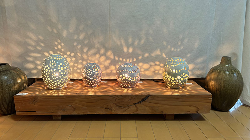 ギャラリーのオーナーは家族3人全員陶芸家。珍しい!焼物の明かり。