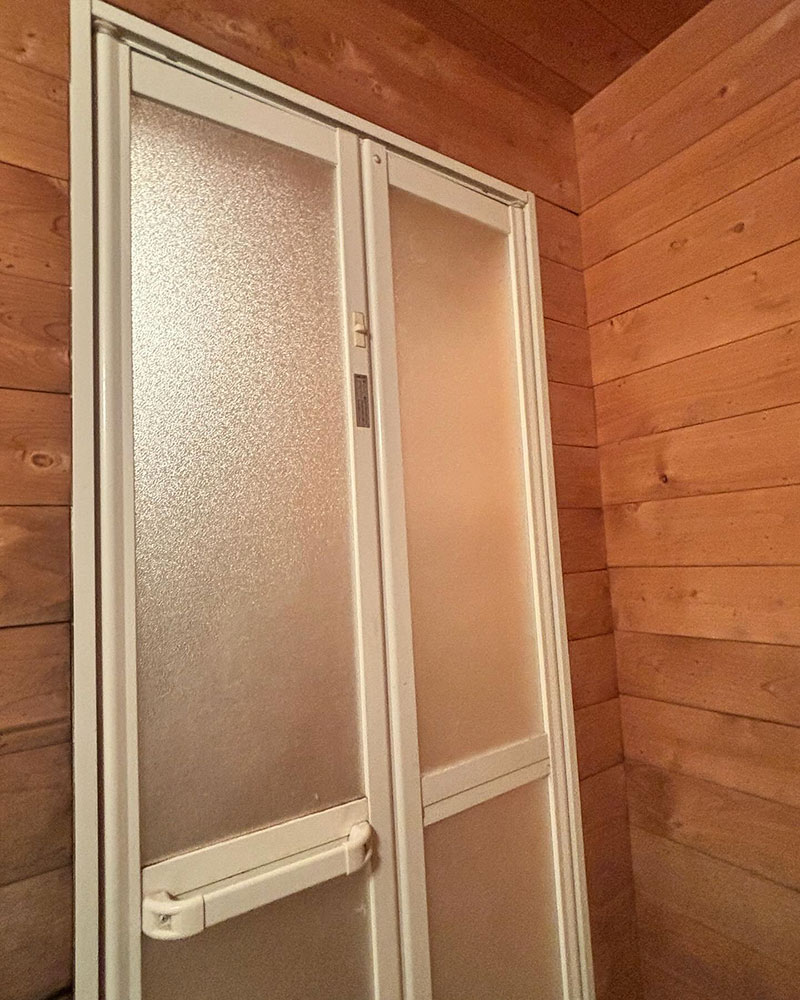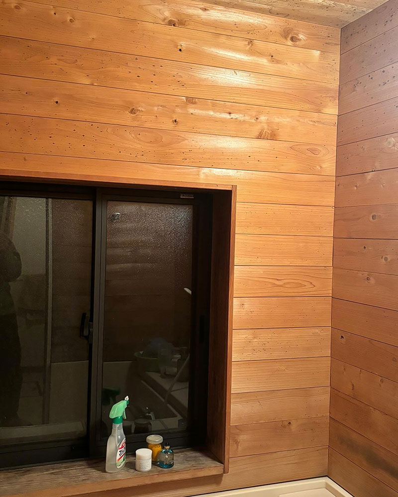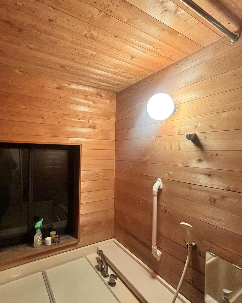 風呂にハーフユニットという腰までの湯船で残りの壁と天上にそれを板にひいて乾燥させたものを張った。