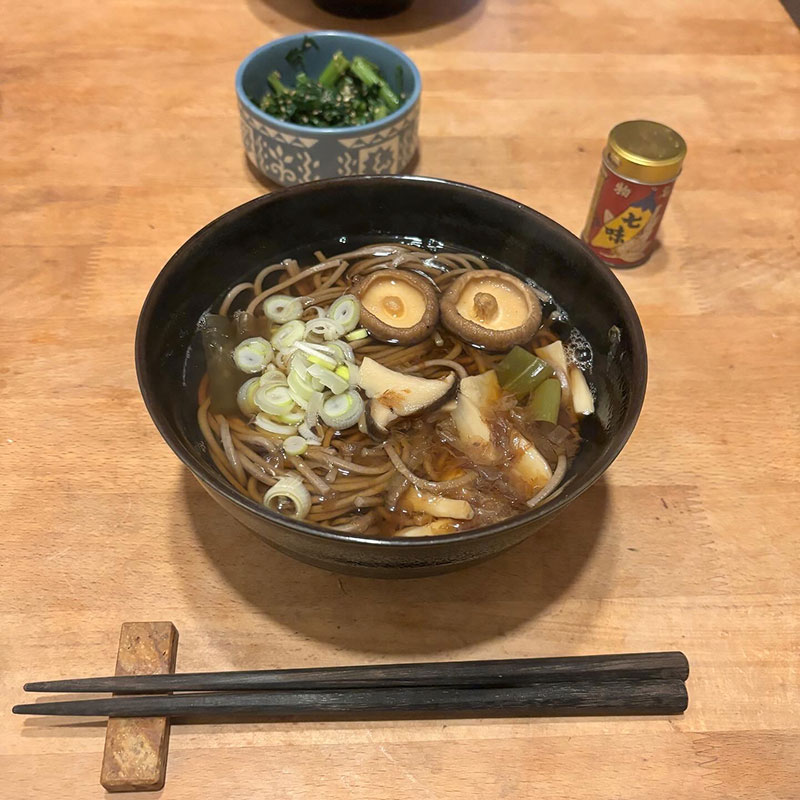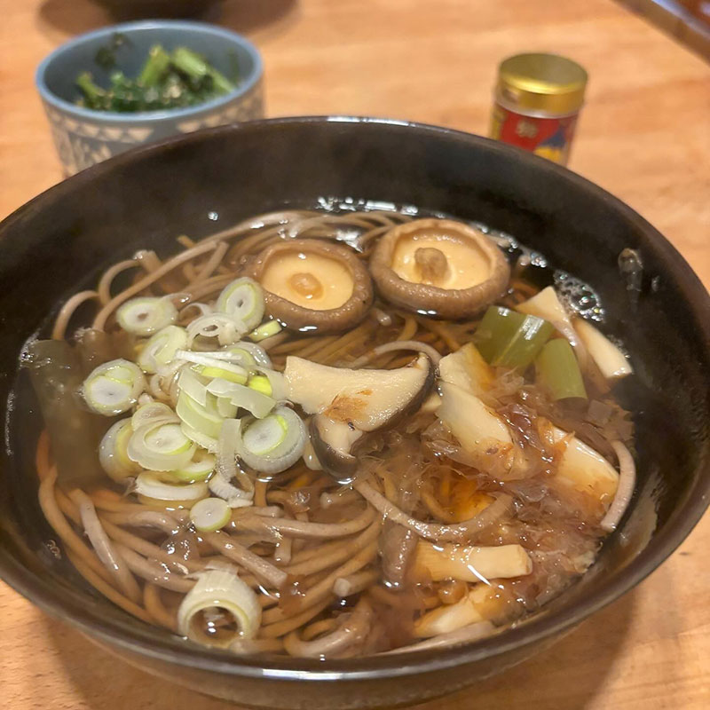 夕食に蕎麦。出汁は自家製干し椎茸とその戻し汁、水出し昆布、冷凍エリンギ、煮干し節、鰹節。最近かえしの作り置きしてないけどこれだけ旨味たっぷりだとみりんと醤油でも充分。
