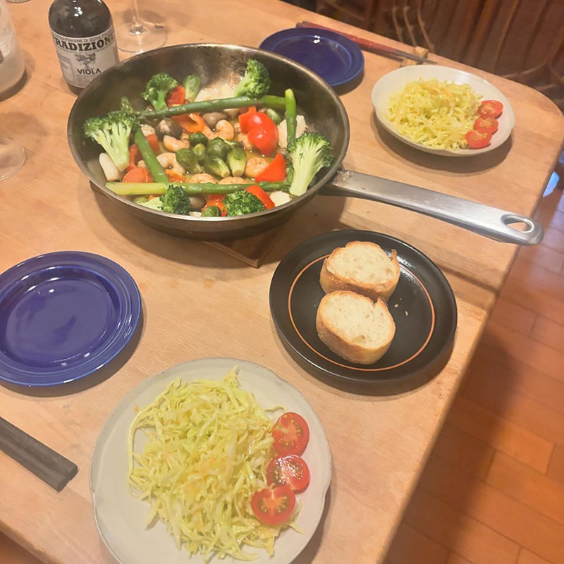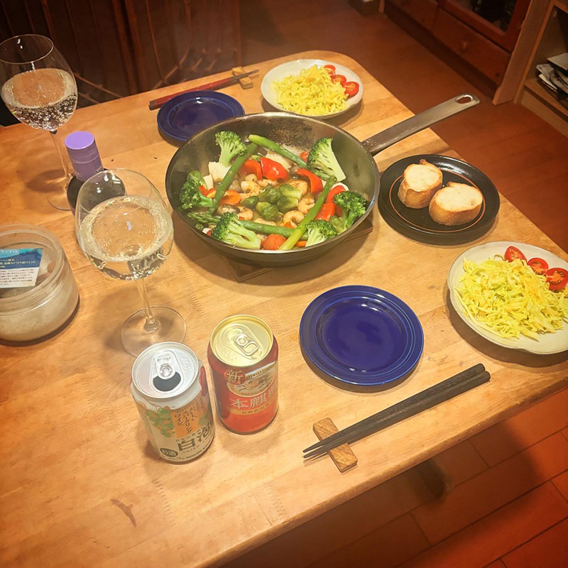 平日は忙しかったので日曜日の今宵、カミさんの誕生会。具沢山のアヒージョ作った。